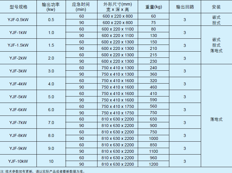 YJSF系列EPS电池配置及尺寸重量一览表