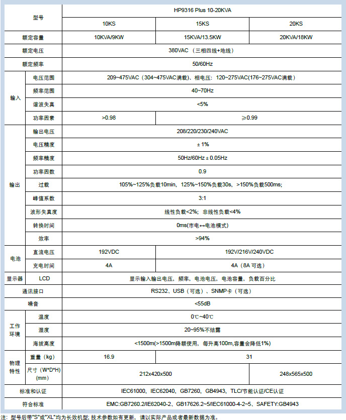 HP9116C/HP9316 Plus 1-20KVA(单进单出/三进单出)双变换在线式UPS,其外形美观,产品性能和产品可靠性大大提升在有效解决断电、市电电压过高或过低、电压瞬间跌落或减幅震荡、高压脉冲、电压波动、浪涌电压、谐波失真、杂波干扰、频率波动的基础上,大幅提高了其在可靠性、高效性、适应性和灵活性等方面的表现,全方位满足了用户对稳定且不间断电力的需求。同时,其所具备的丰富的可扩展功能,也为满足用户的个性化需求提供。