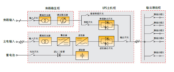 静态开关可实现不间断的完成旁路与逆变的切换功能,切换可以自动完成也可以通过手动完成。