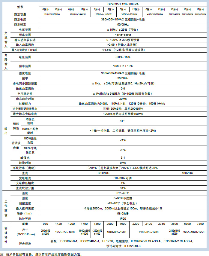 GP9335C系列UPS采用AC-DC-AC双变换器。AC-DC采用SCR三相全控桥式整流器,把三相交流输入电压变换成稳定的直流母线电压。整流器同时兼充电器功能,并采用业界先进的温度补偿技术,可以有效延长电池使用寿命。DC-AC逆变器主功率采用大功率绝缘栅双极性晶体管IGBT作为其逆变元件,控制上采用了先进的空间矢量脉宽调制 (SVPWM)技术,把直流母线电压逆变回交流电压。