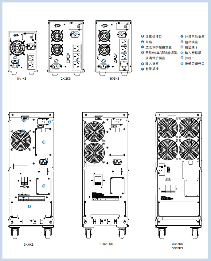 • 自动重启功能(电池供电终止,市电恢复正常供电时,自动开机供电)